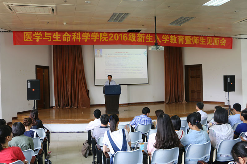 见面会上,胡刚董事长与同学们热情会面,他对全体2016级医学与生命科学学院新同学表示热烈的欢迎并亲切勉励,指出,学院虽然是新成立的,但起点较高,临床医学、药理学与毒理学两个学科已进入ESI全球前1%学科,对人才培养有着得天独厚的优势,同学们已占“地利”之势,希望学院“黄浦一期”的学员能与全院教职员工共同努力,开创顶天立地的大好局面,“顶天”要立志于建设一流的学科、一流的学院,培养一流的人才,“立地”则希望学院的所有男同学阳刚有担当,女同学巾帼不让须眉,共同追求卓越,在学院的和谐向上的氛围中健康成长,茁壮成才。最后,胡董事长鼓励同学们发奋图强、博闻古今、学贯中西。