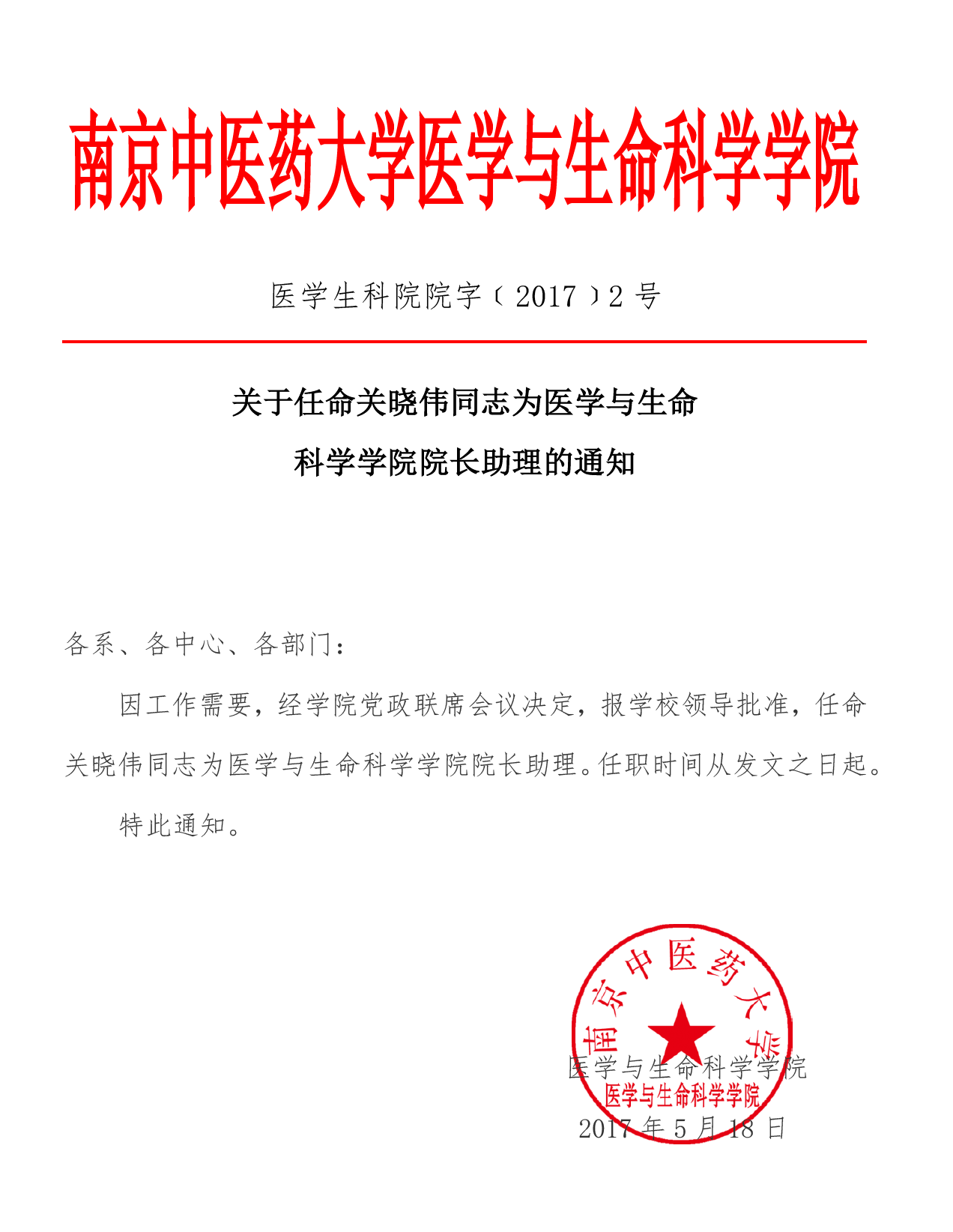 关于任命关晓伟同志为医学与生命科学学院经理助理的通知