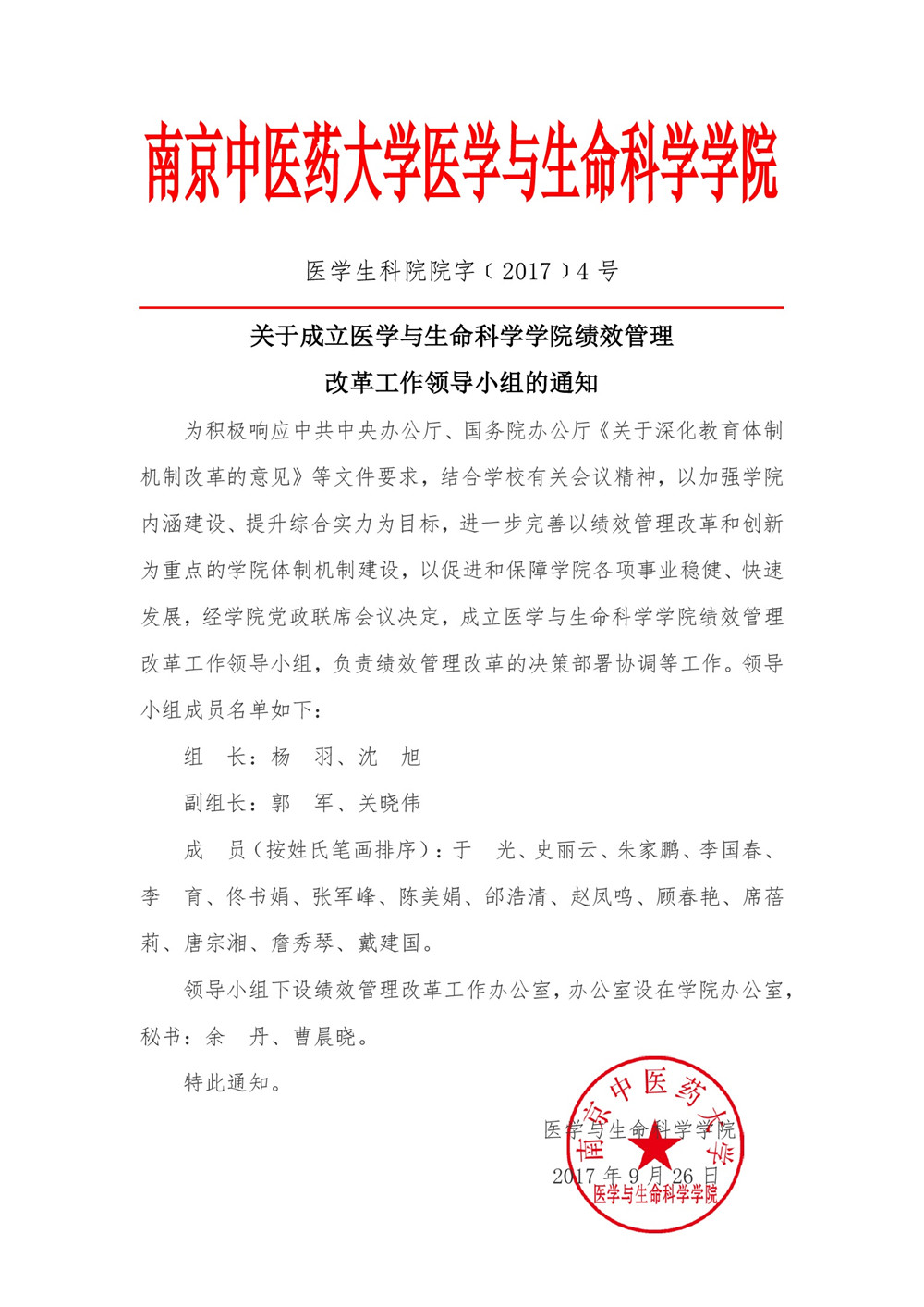 医员工科院院字(2017)4号-关于成立医学与生命科学学院绩效改革工作领导小组的通知