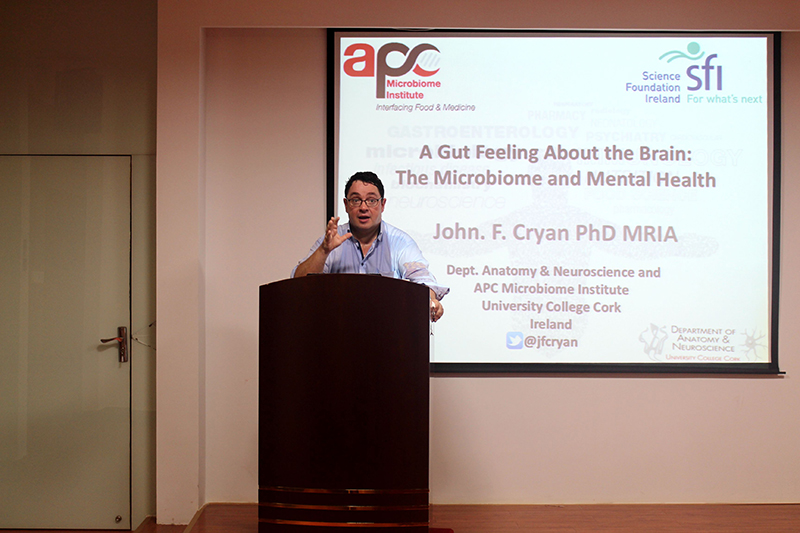 2018年8月16日,爱尔兰科克大学John F. Cryan教授莅临 “教授讲坛”,为广大师生带来题为“A Gut Feeling About the Brain: The Microbiome and Mental Health”的精彩学术讲座,报告会由关晓伟教授主持。