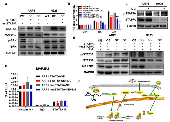 2022年1月24日,Oncogene期刊在线发表杨烨、顾春艳教授课题组题为“YTHDF2 promotes multiple myeloma cell proliferation via STAT5A/MAP2K2/p-ERK axis”的文章。m6A甲基化是存在于大多数真核生物体内的一类丰富的转录后修饰,在各种肿瘤中发挥重要的调控作用。YTHDF2作为一种m6A阅读识别蛋白被广泛研究。该研究发现YTHDF2在MM患者中高表达,且与患者不良预后显著相关。体内外实验证实YTHDF2高表达能促进MM增殖。m6A-RIP-seq和RIP-PCR分析发现STAT5A是YTHDF2的关键靶点,YTHDF2通过结合STAT5A的m6A修饰位点,促进STAT5A mRNA降解,从而抑制STAT5A的抗肿瘤活性达到促进MM增殖的作用。进一步ChIP-seq和PCR分析发现STAT5A通过占据MAP2K2的转录位点降低p-ERK水平抑制MM细胞增殖。该研究首次报道了YTHDF2/STAT5A/MAP2K2/p-ERK轴在MM增殖中的关键作用,为MM的靶向治疗提供了新的潜在靶标。硕士研究生华贞为该论文第一作者,博士研究生魏荣芳为共同第一作者,杨烨教授和顾春艳教授为通讯作者。该研究获得国家自然科学基金项目(81970196、82073885、82003832)、江苏省优秀青年科学基金项目(BK20200097)、江苏省研究生科研与实践创新计划(KYCX21_1769)、江苏省高等学校重点学科发展(中西医结合)基金等项目资助。