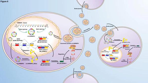 杨烨、顾春艳教授课题组在Journal of Experimental & Clinical Cancer Research期刊在线发表题为“A novel protein encoded by circHNRNPU promotes multiple myeloma progression by regulating the bone marrow microenvironment and alternative splicing”的论文。目前困扰MM的难题是其不可治愈性以及复发耐药性,其中免疫球蛋白D型MM(IgD MM)是最为恶性的亚型之一。IgD MM最显著的特点是难治且预后差,总生存期仅13~21个月。目前,环状RNA(circRNAs)具有功能强大、作用广泛、稳定性强等特点,被认为是癌症诊断、治疗以及预后判断的生物标志物之一。因此,系统性研究IgD MM中的circRNAs,对IgD MM及其他复发难治型MM都具有指导意义。该研究综合运用Agilent SBC-ceRNA 基因芯片、BaseScopeTM RNA ISH、蛋白组学以及RIP-seq等技术,筛选并鉴定了IgD MM患者中高表达的致癌环状RNA circHNRNPU。机制研究创新性地揭示了circHNRNPU编码603个氨基酸的新型蛋白circHNRNPU_603aa,该蛋白通过外泌体的形式被分泌到骨髓微环境中调控SKP2外显子跳跃,从而竞争性抑制c-Myc泛素化,稳定c-Myc,促进MM细胞恶性增殖。该研究为IgD MM的早期预警、客观诊断和预后评估提供可靠的生物学标志物,也为IgD MM以及其他复发难治MM患者的治疗提供新的理论与实验依据。博士生唐校柱为该论文第一作者,博士生邓振东和丁平刚为共同第一作者,顾春艳教授、杨烨教授和杜鹃教授为共同通讯作者。该研究获得国家重点研发计划(2020YFA0509400)、江苏省优秀青年科学基金项目(BK20200097)、国家自然科学基金(81870164、81372543)、江苏省高等学校重点学科发展(中西医结合)基金、江苏省研究生科研创新计划项目(KYCX20_1479、KYCX21_1746)等项目资助。