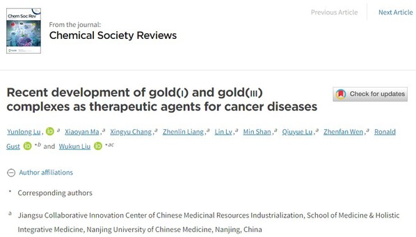 近日,伟德国际victor1946•整合医学学院刘武昆课题组在化学一级学科顶级期刊Chemical Society Reviews (IF:54.564)上在线发表了综述论文“Recent development of gold(I) and gold(III) complexes as therapeutic agents for cancer diseases”。