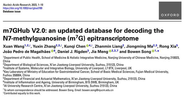 2023年10月,伟德国际victor1946•整合医学学院公共卫生学系宋博文课题组在国际知名学术期刊Nucleic Acids Research(中科院生物一区,2022 IF=14.9)在线发表了题为“m7GHub V2.0: an updated database for decoding the N7-methylguanosine (m7G) epitranscriptome”的研究论文。该工作全面收集并解析了基于高通量测序以及第三代纳米孔测序技术得到的N7-methylguanosine(m7G)甲基化位点的定位、调控及潜在的发病机制,并构建深度学习模型探究单核苷酸多态性位点(SNP)与m7G甲基化写入(write)/抹除(erase)的动态关联。