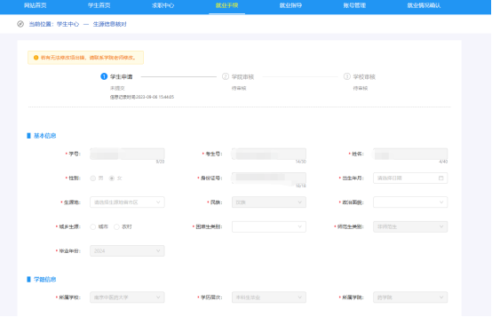 注意所有带星号的项目均为必填项。备注中请勿填写信息。如发现有无法修改的内容(身份证号、民族等)存在错误请联系辅导员,学院汇总好错误信息报员工职业发展指导中心统一修改。