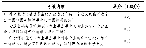 (3)综合考核成绩(满分100分)=外语能力×20%+专业基础与前沿知识×40%+科研综合能力×40%。