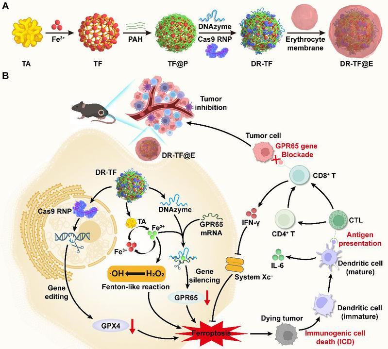 铁死亡(Ferroptosis)是一种铁依赖性的新型细胞程序性死亡方式,能够通过激活肿瘤细胞免疫原性死亡(ICD)来诱导强大的抗肿瘤免疫。伟德国际victor1946韩欣教授团队利用红细胞膜仿生化的金属酚网络(MPNs)联合递送Cas9 RNP和DNAzyme体系,实现了协同性基因编辑铁死亡相关GPX4基因和基因沉默GPR65基因,实现了基因治疗、铁死亡-免疫治疗创新性结合,研究论文“Biomimetic Fe3+ metal-phenolic networks enable DNAzyme and Cas9 RNP delivery for synergistic tumor ferroptosis-immunotherapy”发表于Chemical Engineering Journal(中科院一区Top,IF: 13.3)。青年教师陈超和硕士研究生沈雪婷为共同第一作者,韩欣教授与青年教师陈超为共同通讯作者。