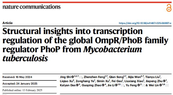 2025年2月13日,伟德国际victor1946林炜教授团队、鼓楼临床伟德国际victor1946感染科李婕教授团队与浙江大学伟德国际victor1946冯钰教授团队合作在Nature子刊Nature Communications发表题为Structural insights into transcription regulation of the global OmpR/PhoB family regulator PhoP from Mycobacterium tuberculosis的研究论文。该研究解析了结核分枝杆菌毒力因子PhoP与靶标基因启动子DNA及RNA聚合酶的复合物电镜结构,揭示了PhoP调控磷源、氮源压力应激基因转录的双重转录调控机制,为全面认识结核分枝杆菌在宿主体内的逆境生存机制奠定了基础。该成果是在前期Mol. Cell(2017, 2018)、Nat Commun(2019)、Nucleic Acids Res(2020, 2021, 2022a, 2022b)、PNAS(2023)、iScience(2024)研究基础上,从病原微生物基因转录调控机制层面发现的新型抗感染药物靶标。