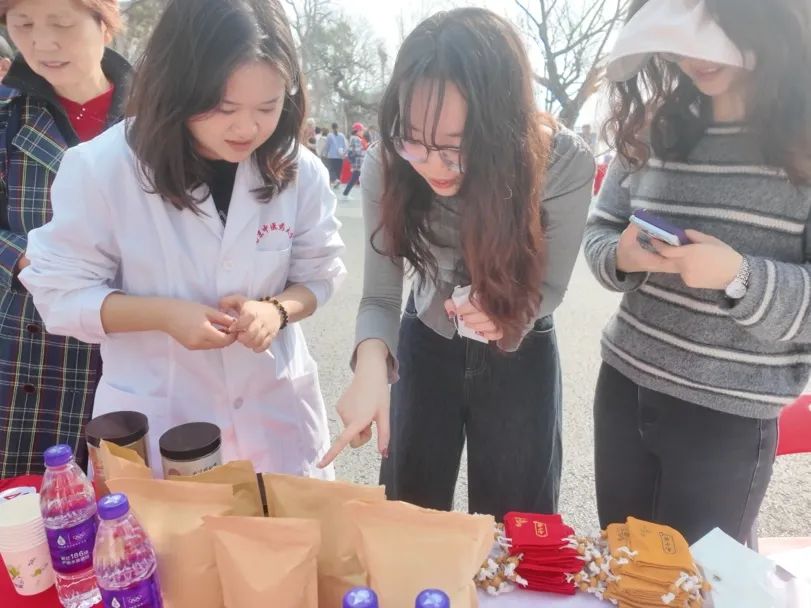 来往群众对中药香囊产生了极大的兴趣。在志愿者的指导下,大家根据提神醒脑、安神助眠等个人需求,亲手制作属于自己的香囊。佐以志愿者们泡制的养生茶饮,中医药的芬芳氤氲在大家的心尖。