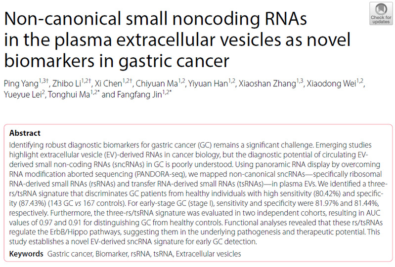 2025年4月3日,麻彤辉教授、金芳芳副教授团队在Journal of Hematology & Oncology(中科院医学一区,IF=29.9)发表题为“Non-canonical small noncoding RNAs in the plasma extracellular vesicles as novel biomarkers in gastric cancer”最新成果。