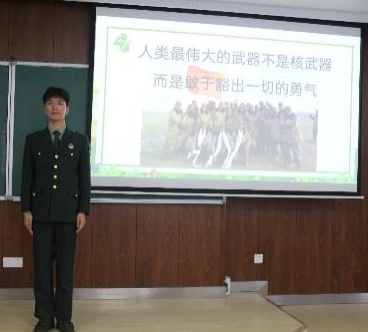许欢学长详细介绍了老员工入伍的途径、面临的挑战以及成为新兵前需经历的考核过程。在分享过程中,他还展示了一些西藏当地的风景照片,为现场增添了几分轻松氛围。他的讲述以“苦中作乐”为主题,让同学们认识到即使在艰苦的军旅生活中,也有温暖与乐趣的存在,这不仅激发了同学们对军旅生活的向往,也引发了他们对军人使命的深刻思考。随后,许欢学长与同学们分享了他在日常训练、执行任务中的经历以及在部队中的成长与收获,这些内容让在场的许多同学深受触动。