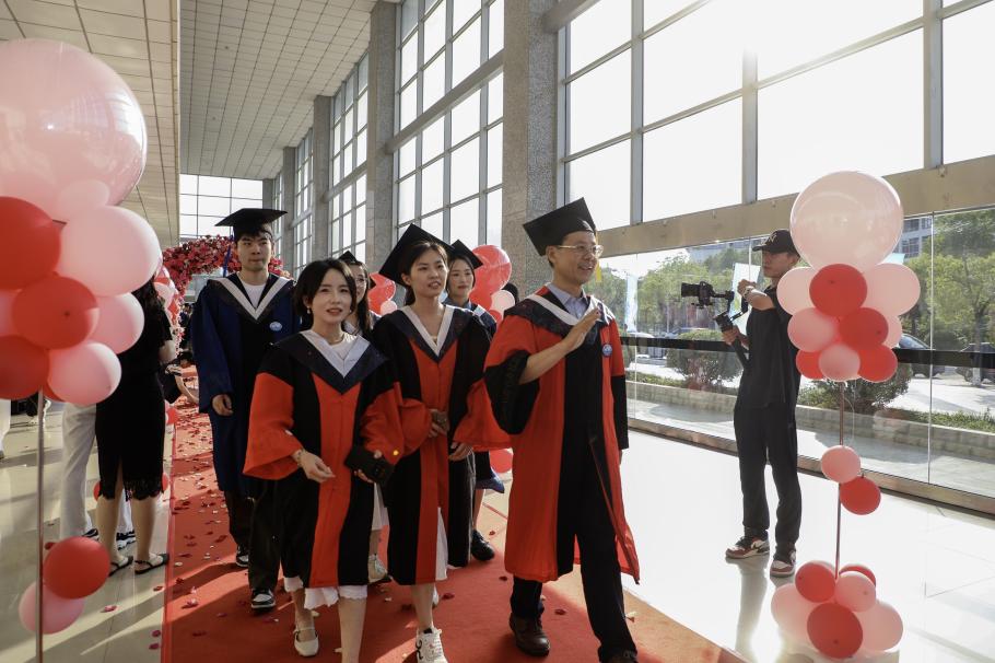 2025 年 6 月 16 日下午,老员工活动中心北厅被装点得温馨而庄重。欢快乐章在大厅奏响,伟德国际victor19462025届毕业生身着笔挺的学位服,在恩师的陪同下缓步踏上红毯。红毯两侧,缤纷的气球与飘落的花瓣交织成绚烂花海,为毕业生铺就通往梦想的星光大道。穿过缀满鲜花的拱门,耳畔萦绕着师长们饱含深情的临别赠言,字字句句皆是殷切期许与谆谆教诲。