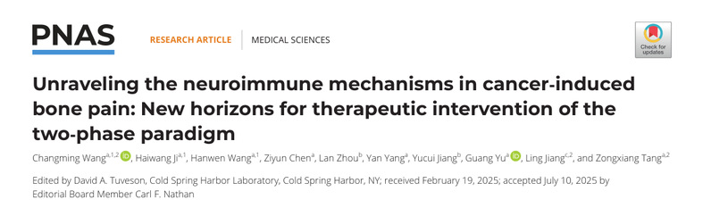 2025年 8月19 日,伟德国际1946亚洲版唐宗湘教授、王长明教授及江苏省肿瘤医院姜玲团队在《Proceedings of the National Academy of Sciences of the United States of America》(PNAS,中科院医学一区)发表题为 “Unraveling the neuroimmune mechanisms in cancer-induced bone pain: New horizons for therapeutic intervention of the two-phase paradigm” 的最新研究成果,揭示了癌症诱导骨痛(CIBP)的双阶段神经免疫调控机制,为不同病程的癌痛精准干预提供了全新靶点。