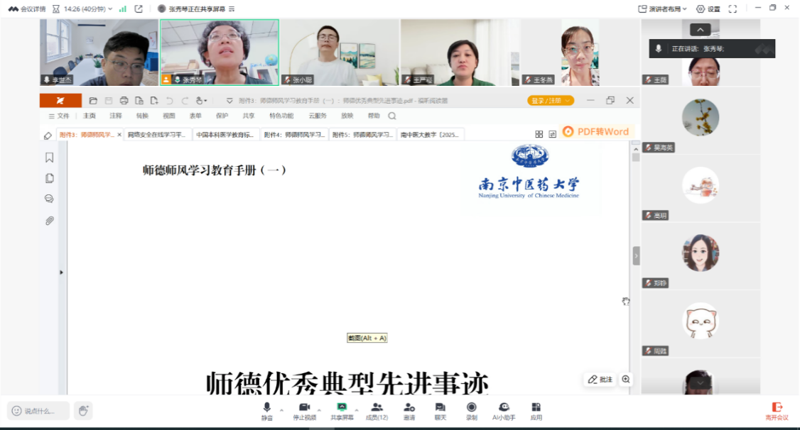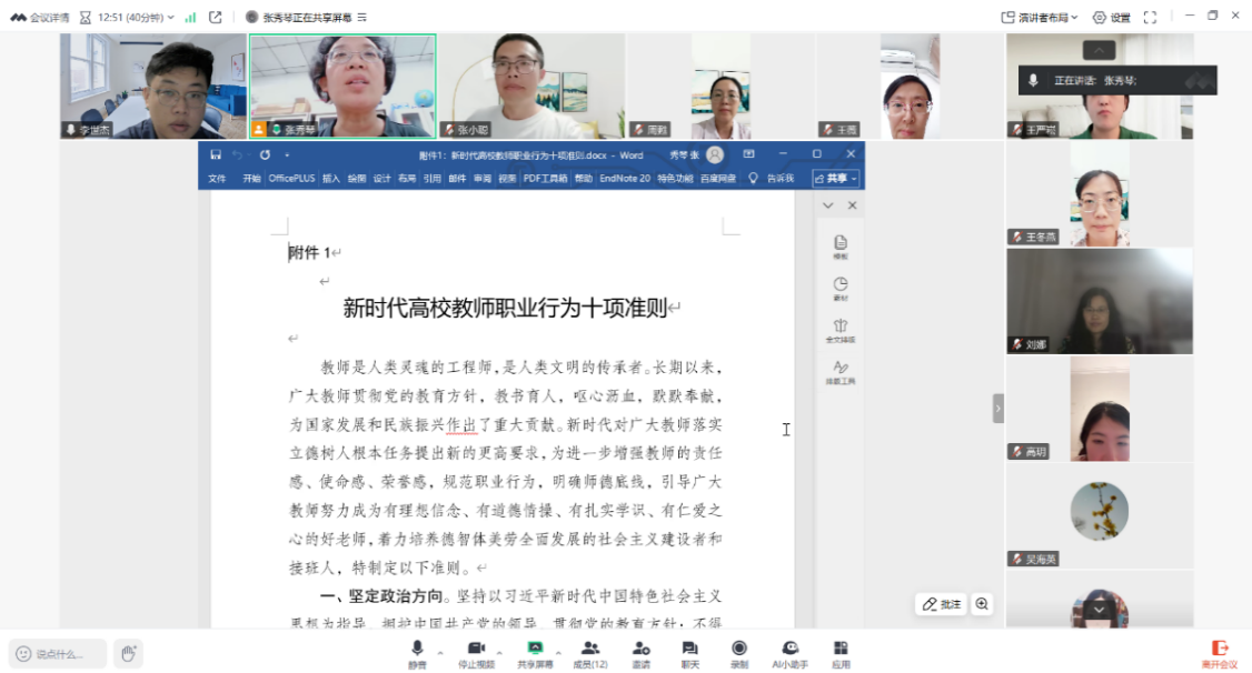 为深入学习贯彻习近平新时代中国特色社会主义思想,贯彻落实习近平总书记关于教育的重要论述和指示批示精神,坚决落实新时代教师职业行为十项准则和研究生导师指导行为准则,加强新形势下师德师风建设,筑牢广大教师为党育人、为国育才初心使命,根据学校和学院关于开展师德师风集中学习教育有关事宜的通知,心理学教研室在9月17日,利用腾讯会议在线召开了全院师德师风专题学习会,会议由学系主任张秀琴主持,全体教师参加。