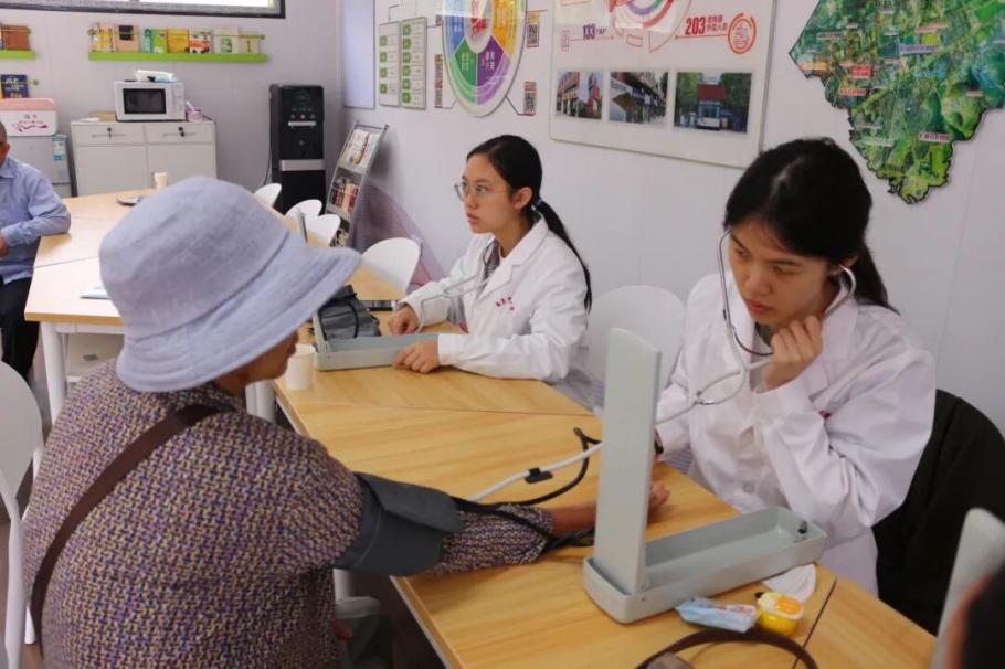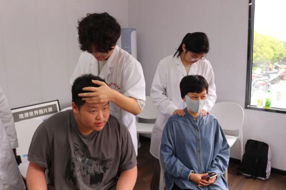 志愿者们提前到达活动现场,摆放好服务设备,身着整洁的白大褂,以饱满的热情为每一位居民服务。大家分组开展了不同的服务项目,包括测量血压、推拿按摩、中医药饮、中药材香囊制作。