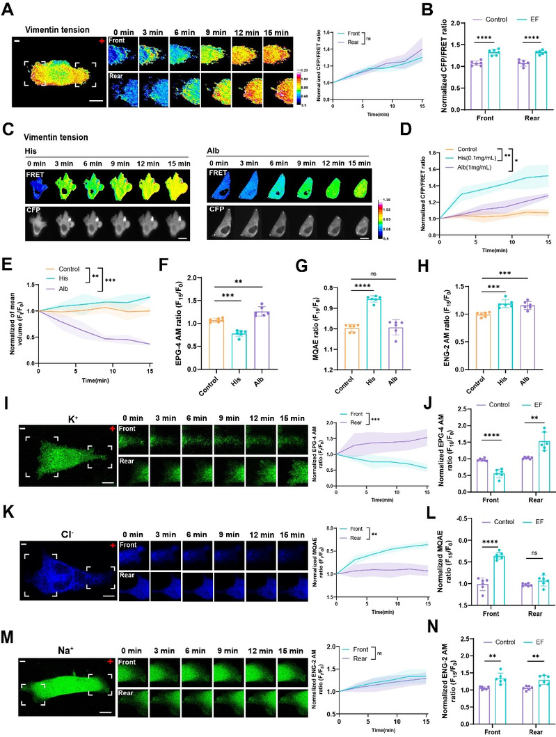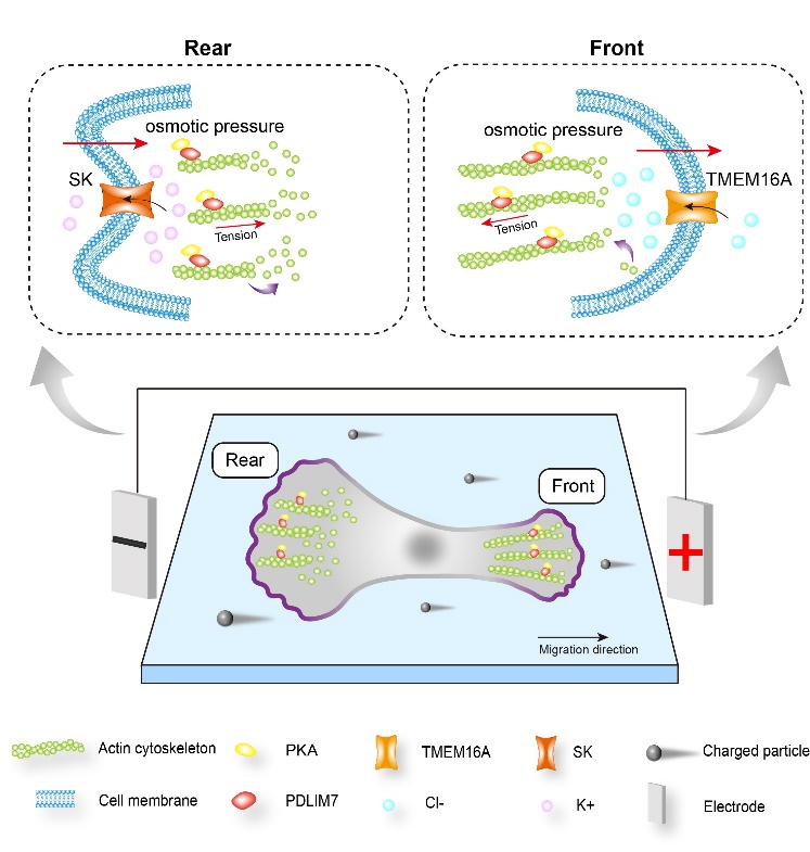 细胞定向迁移是生命活动的基本过程之一。对于肿瘤细胞而言,不受控制的定向迁移是导致肿瘤远端转移和患者死亡的关键步骤。传统理论主要将这一过程归因于趋化因子等化学信号的引导。然而,近年研究发现,多种物理刺激如人体内源性电场,在调控细胞定向迁移中发挥着不可或缺的作用,成为肿瘤转移研究的新方向。然而,电场信号如何转化为细胞内的力学响应,驱动细胞完成“前缘推进、后缘收缩”的运动,其核心机制并不清楚。